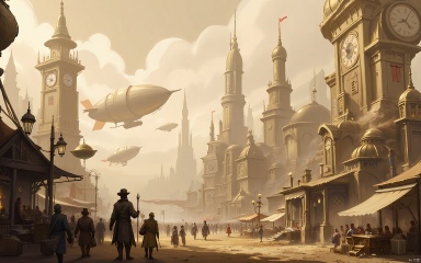 GNSJ, conceptual design, A steampunk metropolis with clockwork towers and flying dirigibles. Detailed mechanical elements and a sepia tone give it a nostalgic feel. Citizens in elaborate costumes go about their daily lives.