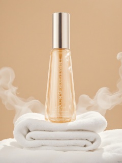 DSCJ, A tall, cylindrical bottle emblazoned with "LuminousEssence" in shimmering silver sits atop a stack of clean towels in a spa-like bathroom setting. The bottle is the focal point, with steam rising from the towels and a soft, warm lighting creating a relaxing atmosphere. The product's claims and highlights are boldly printed on the label.