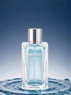 DSCJ, Photograph of a clear, square perfume bottle with a silver cap, filled with blue liquid, placed on a reflective surface with water droplets. The background is a gradient blue, with a shallow depth of field, keeping the bottle in sharp focus while the background is blurred. The bottle is centered, with the brand name "Nerdsd" and the text "Aqua Fresh" visible. The lighting is soft, highlighting the transparency of the liquid. The overall aesthetic is clean and modern.