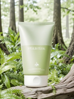 DSCJ, A photograph of a green, gradient tube of skincare product labeled "Biossance" with the text "Squalane + Peptide" in white. The product is placed on a mossy rock in a lush, dense forest with tall trees and ferns. The background is slightly blurred, focusing on the product. The lighting is soft and natural, highlighting the green hues of the product and the forest. The camera angle is straight-on, capturing the product from the front. The depth of field is shallow, with the background elements slightly out of focus. The overall mood is serene and natural.