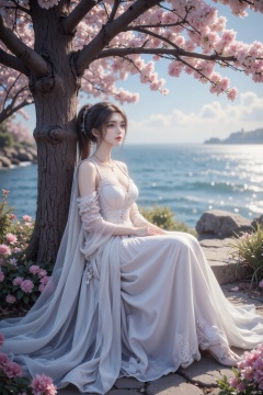 Oshino Shinobu from Gown,cute girl,wearing white gothic-style gown.strong sense of light,high contrast light,shining details,wide scene,digital painting,dreamy mood,ethereal,fantasy art style,fantasy concept art,high contrast,ultra-detailed,charming anime-inspired,with slight lighting,and tree surrounded blossom by,sitting under the flowers,the Dundar light from above,digital art,illustration,charming,ethereal,mysterious,fantasy,ethereal,elegant,airy,magical,surreal,dreamy,strong sense of light,outdoors,beside the coast,sea in background,floating dress in the gentle breeze,from side,her head turn back towards viewer