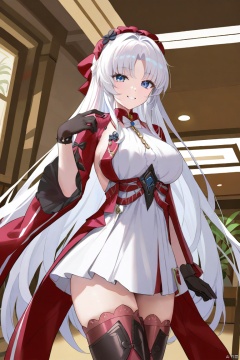 (score_9,score_8_up,score_7_up), (masterpiece),( beautiful),(high quality),(finely detailed),extremely detailed CG unity 8k wallpaper,best quality, 1girl, solo, long hair, breasts, looking at viewer, smile, bangs, blue eyes, large breasts, parted_bangs , red bow, thighhighs, gloves, dress, very long hair, white hair,  black gloves, black thighhighs, indoors, white dress, cowboy_shot,carlotta