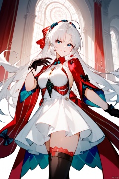 (score_9,score_8_up,score_7_up), (masterpiece),( beautiful),(high quality),(finely detailed),extremely detailed CG unity 8k wallpaper,best quality, 1girl, solo, long hair, breasts, looking at viewer, smile, bangs, blue eyes, medium breasts, parted_bangs , red bow, thighhighs, gloves, dress, very long hair, white hair,  black gloves, black thighhighs, indoors, white dress, cowboy_shot,carlotta