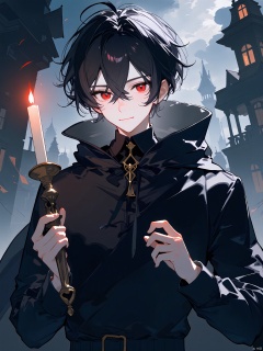 Anime head portrait, ecy, depicting a mysterious anime boy with black hair and red eyes, dressed in a dark cloak and holding a candlestick. The background is a haunted mansion with eerie shadows and cobwebs. The lighting is dramatic and moody, enhancing the suspenseful atmosphere. The design respects the rule of thirds, with a faintly blurred background.