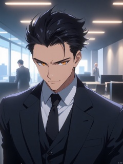 A male character with slicked-back black hair and intense amber eyes. He wears a tailored suit and tie, exuding power and authority. The background is a corporate office with sleek modern furniture.