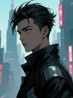 A male protagonist with tousled, dark hair and intense emerald eyes. He dons a leather jacket with silver patches, standing against a faintly blurred urban landscape of skyscrapers and neon lights.