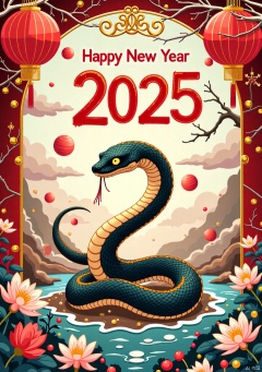 Chinese New Year,lingshe,Dunhuang Art,Overlapping scales,Dunhuang Art,Year of the Snake poster,traditional Chinese elements,Above the picture is written "Happy New Year 2025",Dunhuang art style,majestic and elegant design,snake occupies a smaller proportion of the composition,positioned gracefully with a non-threatening and friendly appearance,smooth flowing lines,Chinese red and gold tones with accents of turquoise and brown,background featuring Dunhuang-inspired patterns such as lotus flowers,flying silk ribbons,auspicious clouds,and subtle mural textures,intricate but balanced details,grand and culturally rich composition,solemn and artistic atmosphere,