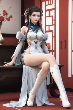 masterpiece, best quality, masterpiece,best quality,official art,extremely detailed CG unity 8k wallpaper,1girl,solo,breasts,(long hair:1.3),black hair,dress,bare shoulders,earrings,looking at viewer,jewelry,boots,detached sleeves,hair bun,double bun,chinese clothes,tassel,wide hips,pelvic curtain,boots,white boots,feet,(full body:1.3),sitting,crossed legs,indoors