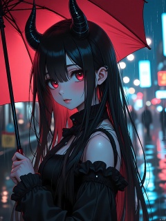 Demon-horned youth, goth lolita attire, raven hair, crimson eyes, umbrella in hand, melancholic pose, rain-soaked alley, neon lights, somber expression, dark fantasy.
