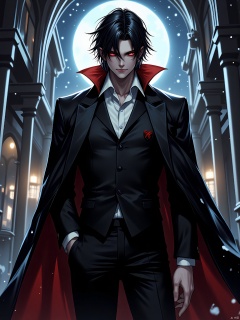 Vampire lord, elegant suit, jet-black hair, crimson eyes, fangs bared, dominant pose, grand castle, moonlit courtyard, seductive gaze, noble vampire.