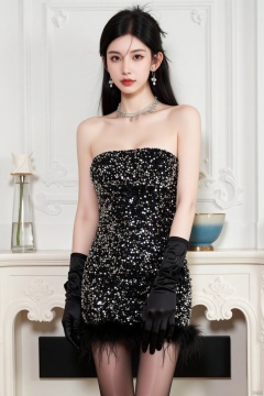 a woman stands in front of a white fireplace. She is dressed in a black strapless dress adorned with white dots. Her hair is styled in a sleek bob, and she is wearing a silver necklace and earrings. Her lips are painted a deep red, and her eyes are a piercing blue. She has a black glove on her left hand, and a pair of black tights on her right hand. The backdrop is a stark white wall, with a blue bowl on the mantel.