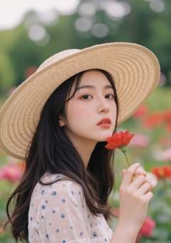 kodak film\(hubgstyle)\, a close-up shot captures a young Asian woman with long dark brown hair, wearing a straw hat adorned with black dots. She is wearing a white sleeveless shirt with a blue and white dotted pattern. Her left hand is holding a red flower, adding a touch of color to the scene. The background is blurred, suggesting a garden of flowers, adding depth to the composition.,
