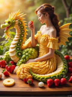 On a wooden chopping board filled with warm golden sunlight, a surreal fruit puzzle is slowly unfolding. In the center of the picture, a graceful and charming woman stands. She has skin as white as snow, and her eyes are like deep amber. With agility and intelligence, he has chestnut curly hair like waves. It fell to her waist, with a few strands of hair hanging playfully on her shoulders. She wore a retro-style goose yellow dress. The slim cut highlighted her graceful figure. The skirt was also embroidered with delicate fruit patterns. She was surrounded by There is a majestic dragon whose body is made entirely of colorful fruits. Emerald green apples are cut into thin slices and stacked layer by layer to outline the strong dragon spine; round strawberries are closely arranged and turned into gorgeous and eye-catching dragon scales; golden pineapple chunks act as sharp dragon claws with an alluring luster; longan but They were two crystal clear lychees, full of juice and looked as if they were about to roll down in the next second. The woman raised her head slightly, looking at the giant dragon with a fearless and curious expression, and there was still a lingering lingering feeling around them. The sweet and fruity aroma,A Bow - Fruit Painting