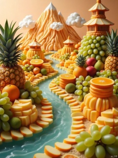 In a clear space of light and shadow, an amazing three-dimensional landscape painting gradually emerges, all delicately constructed of colorful fruits. In the foreground, a gurgling "stream" is rushing past, which is paved with transparent and bright grape bunches. The round grapes are close together, and the juice is ready to drip out. They reflect the smart light under the dim light, just like the water of a stream. Flickering, beside the stream, golden pineapple blocks are piled up in an orderly manner as "reefs". The rough skin of the pineapples is like the texture of stones that have been washed over time. Moving towards the middle ground, the undulating "mountains" rise from the ground, and the mountains are cut into Thin slices of apples are layered on top of each other, from the fresh green of green apples to the warm and bright colors of red apples, bringing out the colors of the four seasons in the mountains and forests. In the meantime, "pavilions and pavilions" made of orange petals are hidden among them. The delicate down and full petals of oranges give the building a unique exquisite texture. In the distant view, "clouds and mist" linger on the top of the mountain, which is Threads of marshmallows, fluffy and dreamy, softly cover part of the mountains, creating an ethereal artistic conception. The entire three-dimensional painting is enveloped in warm orange light, and the air is filled with sweet and fruity fragrance, which makes people enchanted. ,A Bow-Fruit Painting
