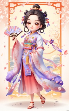 Best quality, masterpiece, 1 girl, chibi, wearing hanfu, [Chinese Valentine's Day theme],low saturation theme, looking at viewer,embroidered robe with exquisite details, gentle and demure disposition, elegant and graceful movements, silk slippers with golden embroidery,Arch bridge, slustrous black hair styled in a neat bun, graceful and precise hand movements, a humble and obedient demeanor, surrounded by the fragrance of flowers and the sound of flowing water,Handheld fan,fan,Chinese fan