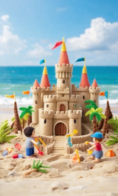 Felt\(hubgstyle)\ children building a magnificent sandcastle on a sunny beach, with detailed towers, moats, and flags, with the ocean waves gently lapping the shore.