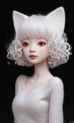 Close-up of the cute hubggirl Felt\(hubgstyle)\ sculpture with an ultra-wide field view. She has short wavy white hair with bangs that falls between her eyes. Her hair is curly. She has cat ears on top of her head and red eyes. She is looking at the viewer with a closed mouth. She is wearing a long-sleeved top. The background is black and the lighting is ultra-dynamic creating amazing shadows and depth of field.