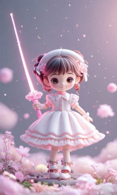 Close-up of the cute hubggirl Felt\(hubgstyle)\ sculpture with with White Lolita outfit ,holding a glowing pink sword upwards, dynamic poses, particle effects, professional 3d model, anime artwork pixar, 3d style, good shine, OC rendering, highly detailed, volumetric, dramatic lighting,