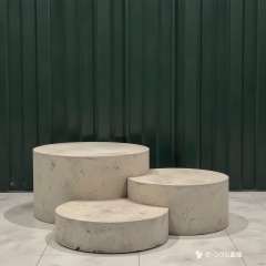 DSZT,E-commerce booth, Photo of a minimalist, modern art installation featuring three circular, beige concrete platforms stacked in a pyramid formation, set against a vertical, dark green, striped wall backdrop. The lighting is soft and even, likely using natural light, with no harsh shadows. The composition uses symmetry and the rule of thirds. The background is in focus, with a shallow depth of field. The aesthetic quality is high. The image was likely taken with a DSLR camera, using a medium aperture setting (around f/8), a moderate shutter speed, and a low ISO.