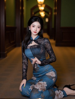 Long qipao dress,The image is a portrait of a young woman posing in a luxurious hallway. She is wearing a blue dress with a floral pattern and black lace sleeves. The dress has a high neckline and long sleeves, and she is holding a black fan in her right hand. She has long dark hair styled in loose waves and is wearing black high heels. The woman is sitting on the floor with her legs crossed and her hands resting on her knees. The background is blurred, but it appears to be a hallway with green walls and a chandelier hanging from the ceiling. The overall mood of the image is elegant and sophisticated.. cheongsam