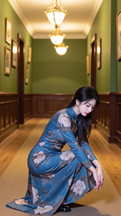 The image shows a young woman crouching down in a hallway with a chandelier hanging from the ceiling. She is wearing a long, flowing blue dress with a floral pattern in shades of blue, white, and pink. The dress has a high neckline and long sleeves, and she is wearing black high heels with red soles. The woman has long dark hair that is styled in loose waves and is looking down at the floor. The hallway has green walls and a wooden floor, and there are several framed pictures hanging on the walls.. cheongsam