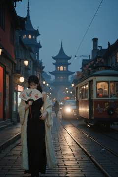 DFM,<lora:Fulan_dongfangmeng_Merjic_F.1:0.5>,Photography,Cinematic lighting, fine art photography,Dreamcore,Mysticism,fantasy and surrealism,psychic,Wong Kar-wai-style movie stills,In a mystical mix of dreamy core and mysticism, imagine an ethereal Chinese woman facing the camera, dressed in a lavish fur-trimmed cheongsam, gracefully navigating the dimly lit cobblestone streets, accentuating her traditional elegance. Her slender hands hold a round fan decorated with birds and flowers, symbolizing her refined taste. The background is a fusion of Chinese and Gothic architecture, with ancient pagodas meeting pointy spires under a twilight sky. A retro two-car tram, reminiscent of 1930s Shanghai, glides by, casting a long shadow over the dimly lit gaslighting atmosphere. The scene is a harmonious blend of historical charm and surreal, otherworldliness,Depth of field, background blur,This artworkevokes themes often associated with East Asian culture combined with elements reminiscent of fantasy literature and film genres,8K Resolution,Perfect Detail,HD Detail,Ultra High Resolution,