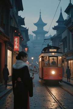 DFM,<lora:Fulan_dongfangmeng_Merjic_F.1:0.5>,Photography,Cinematic lighting, fine art photography,Dreamcore,Mysticism,fantasy and surrealism,psychic,Wong Kar-wai-style movie stills,In a mystical mix of dreamy core and mysticism, imagine an ethereal Chinese woman facing the camera, dressed in a lavish fur-trimmed cheongsam, gracefully navigating the dimly lit cobblestone streets, accentuating her traditional elegance. Her slender hands hold a round fan decorated with birds and flowers, symbolizing her refined taste. The background is a fusion of Chinese and Gothic architecture, with ancient pagodas meeting pointy spires under a twilight sky. A retro two-car tram, reminiscent of 1930s Shanghai, glides by, casting a long shadow over the dimly lit gaslighting atmosphere. The scene is a harmonious blend of historical charm and surreal, otherworldliness,Depth of field, background blur,This artworkevokes themes often associated with East Asian culture combined with elements reminiscent of fantasy literature and film genres,8K Resolution,Perfect Detail,HD Detail,Ultra High Resolution,