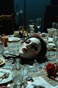 GSL,<lora:Fulan_guishilu_merjic_F.1:0.8>,surrealist Grotesque photography,A surreal scene of a masquerade ball gone awry, with an abandoned masked figure lying amidst shattered glass and scattered tableware