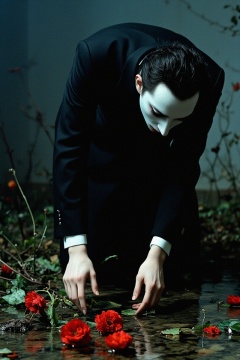 GSL,<lora:Fulan_guishilu_merjic_F.1:0.8>,surrealist Grotesque photography,A figure in a black suit and white mask, bending over to pick red flowers from water,with a deep and dim background