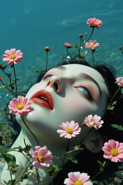 GSL,<lora:Fulan_guishilu_merjic_F.1:0.8>,surrealist Grotesque photography,A surreal underwater scene with a woman's face partially submerged,adorned by delicate pink flowers floating around her,