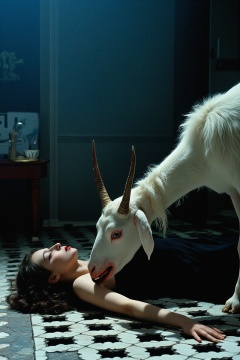GSL,<lora:Fulan_guishilu_merjic_F.1:0.8>,surrealist Grotesque photography,A surreal encounter between a woman lying on a lattice floor and a grotesque white goat, indoors, dark environment,