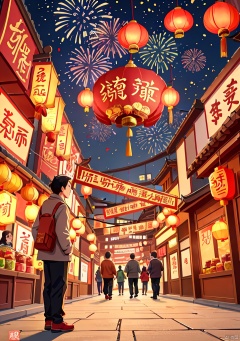 Illustrations of Chinese New Year style,(texture, brush strokes, color blocks),new year,Fireworks,A live street,ancient Chinese architectural complex,at night,there are two Kongming lanterns in the sky,many people play in the street,perfect composition,harmony of light and shadow,asymmetrical composition,2025yanhua
