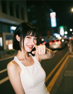 neomj,flashlight,Film Photography,A young woman with short bobbed hair and bangs winks and points a finger at the viewer while smiling. She wears a white dress. The background is a blurry city street at night with soft,diffused lights. The light has a warm tone.,<lora:neomj闪光灯v3_14:1>,