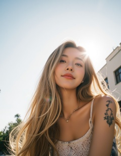 neomj,flashlighting,low-angle,wide shot,Film Photography,a fashion shot,The lighting is bright and sunny,with a warm,natural daylight feel,creating a cheerful and airy atmosphere,A young woman,smile,a cheerful and airy atmosphere,<lora:neomj闪光灯v3_12:1>,