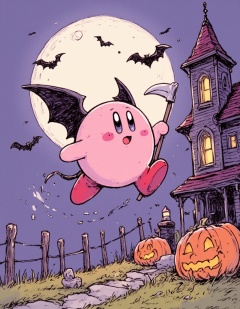 neomj,illustration,A pink Kirby with black wings and a tail flies in front of a full moon,holding a scythe. There are several bats and a haunted house in the background. Light comes from the moon and the jack-o'-lanterns.,<lora:neomj故事感线条水彩风10:1>,
