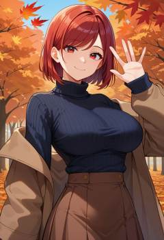 score_9, score_8_up, score_7_up, 1girl, autumn, autumn leaves, black sweater, bob cut, breasts, brown coat, brown skirt, closed mouth, coat, large breasts, leaf, leaf background, long sleeves, looking at viewer, medium hair, off shoulder, orange background, red eyes, red hair, ribbed sweater, skirt, smile, solo, sweater, swept bangs, turtleneck, turtleneck sweater, upper body, waving