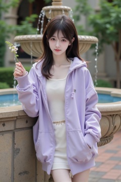 In the charming courtyard of the estate, a young Asian woman with shoulder-length, straight black hair and a sweet expression stands near a vintage fountain. Her hair is slightly damp, giving it a glossy appearance. She is wearing a borrowed long hoodie in a soft lavender, which adds a touch of elegance to her look. The hoodie is slightly open, revealing her long sleeves and a hint of her collarbone. Her posture is playful yet poised, as she leans against the fountain, one hand resting on the edge while the other holds a small, delicate flower. Her thighs are subtly visible, adding a sense of innocence and allure. The shot is taken from a diagonal angle, capturing her against the backdrop of the fountain and surrounding stone architecture, creating a timeless, romantic atmosphere.