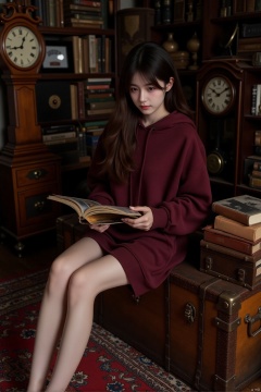 In the whimsical attic of the estate, a young Asian woman with long, wavy brown hair and a curious expression sits on an old wooden trunk. Her hair cascades down her back, giving her a bohemian vibe. She is wearing a borrowed long hoodie in a rich burgundy, which complements her olive skin tone. The hoodie is slightly oversized, allowing her long sleeves to drape over her arms. Her posture is relaxed as she flips through an old photo album, her thighs visible as she sits cross-legged. The shot is taken from above, capturing her seated on the trunk surrounded by vintage items like antique clocks and old books, creating a nostalgic and enchanting atmosphere.