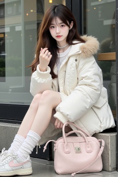 1girl,solo,long hair,looking at viewer,brown hair,long sleeves,jewelry,sitting,jacket,full body,shoes,choker,socks,necklace,bag,black eyes,lips,white footwear,ring,white jacket,white socks,sneakers,realistic