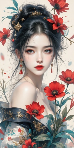 abstract 3 d, woman holding flowers airbrushed, Eugeniusz Zak, tumblr, turquoise, ruby, black, white, Sylvain Sarraj and Igor Morski, featured on artgerm, clubbing flame, abstract 3 d work, awesome