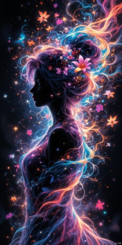 A surrealist illustration of a womans silhouette, full body, with swirls of bright multicolored blacklight ink swirling around her in beautiful colors. flowers in her hair