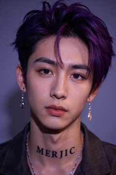 a young man,his purple hair is styled in a sleek modern look,earrings,with tattoo text "MERJIC" on his neck,soft lighting,high resolution,professional grade,RAW photography,evocative composition,Cinematic Lighting,moody lighting,perfect eyes,depth of field,virtual background,eyes focus,<lora:majichandsome1:0.8>,