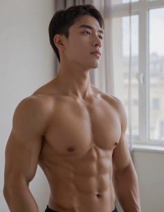 The image is a photograph of a muscular, athletic young man with a light to medium brown skin tone and short, styled hair. He is standing in a minimalist, modern room with a white wall and a large window with a sheer, floor-length curtain in a light gray-brown color.<lora:majichandsome2:0.8>,
