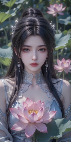 sdmai,bohenv,Lotus,lotus pond,water drops,1girl,solo,realistic,flower,looking at viewer,water,black hair,parted lips,jewelry,long hair,earrings,brown eyes,lips,