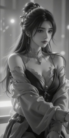 Black and white portrait, full body, high contrast, soft focus, subtle grain, ethereal atmosphere: A woman in elegant attire, dynamic pose, Motion Blur effect, wispy hair, gentle facial expression, Captured with a Long Exposure Photograph, emphasizing speed and fluidity.
