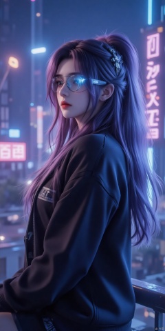 A stunning cyberpunk heroine with an electronic eyeglass, set against a backdrop of neon-lit cityscapes. The framing captures her profile, the eyeglass a sleek, futuristic fixture on her left eye. Soft blue lighting casts a warm glow, contrasting with the dark, gritty urban landscape. She stands confidently, one leg slightly bent, her long hair flowing like digital code.