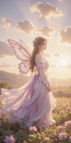 (best quality,4k,8k,highres,masterpiece:1.2),ultra-detailed,(realistic,photorealistic,photo-realistic:1.37)"((Innocent)) girl, golden hour, dreamy meadow, ethereal, whimsical, flowing dress, soft sunlight, enchanting, butterfly wings, (pastel clouds), liquid reflections,PorcelainDollPrincess,Ar89,BEST_OF,concept art