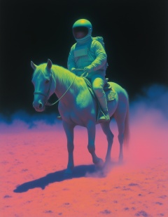 <lora:迷幻8:0.8>,a man in a space suit riding a horse in a field of dust with a neon colored background and a black background,Beksinski,technicolor,a hologram,holography,