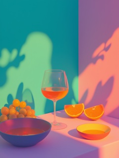 <lora:c10:0.8>,cartoon,serene,vibrant, colorful setting, wine glass, orange liquid, sliced oranges, grapes, a bowl, teal and pink, neon lights, shadows on wall