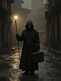 <lora:dark8:0.8>,dark,a man in a medieval doctor's black robe,wearing the mask of the crow doctor,with a suitcase in hand,rainy night,walk on the street,the eyes are red,the streets of the middle ages,there's a light on the side of the road,with 1 long black scepters in his hand,